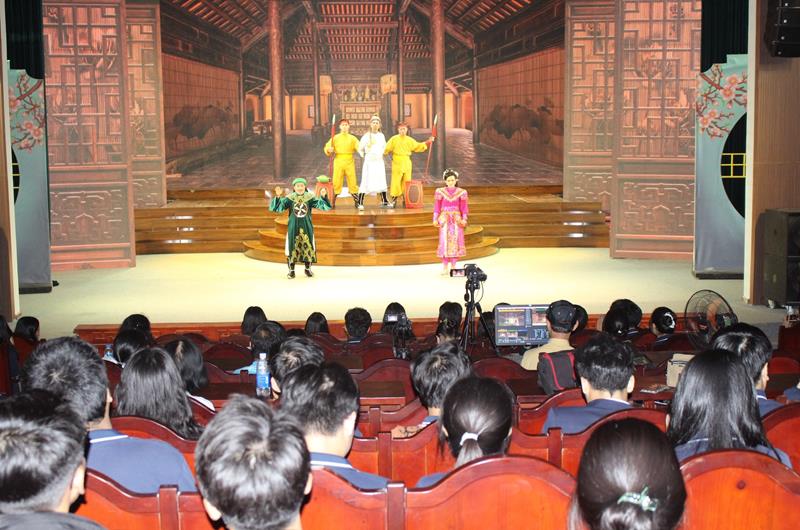 Các nghệ sĩ của Nhà hát Nghệ thuật Đồng Nai biểu diễn cải lương, phục vụ cho đối tượng học sinh trên địa bàn tỉnh