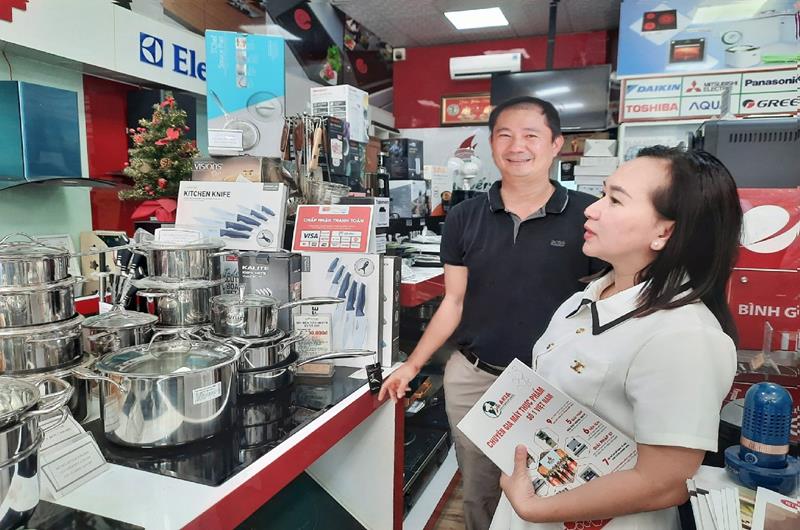 Ông Đỗ Vĩnh Sỹ giới thiệu sản phẩm cho khách hàng tại một cửa hàng chuyên doanh của hệ thống Vua Bếp