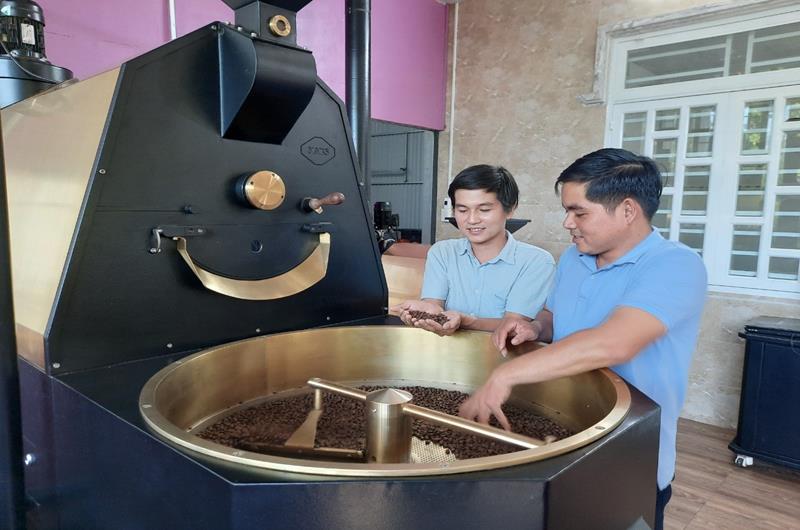 Anh Thiện ((bên trái) cùng cộng sự kiểm tra chất lượng cà phê đang rang trên hệ thống máy hiện đại)