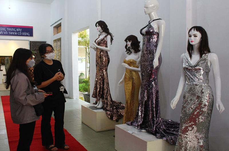 Khách tham quan sản phẩm mỹ thuật ứng dụng (thiết kế thời trang) trưng bày, giới thiệu tại Trường cao đẳng Mỹ thuật trang trí Đồng Nai