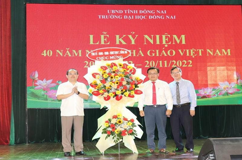 Đồng chí Quản Minh Cường, Phó Bí thư Tỉnh ủy, Trưởng đoàn Đại biểu Quốc hội tỉnh tặng lẵng hoa cho các thầy, cô giáo Trường Đại học Đồng Nai nhân kỷ niệm Ngày nhà giáo Việt Nam 20-11