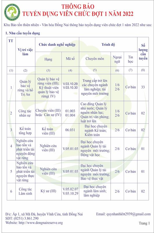 Thông báo tuyển dụng của Khu Bảo tồn thiên nhiên - văn hóa Đồng Nai