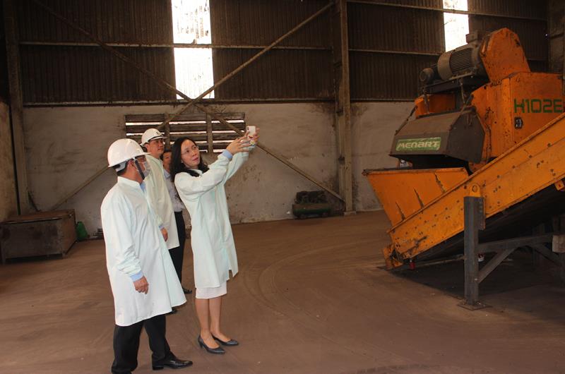Giám đốc KXL chất thải xã Quang Trung Trần Thị Thuý giới thiệu công nghệ của nhà máy với đoàn công tác của Tổng cục môi trường
