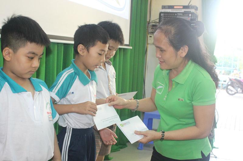 Cô Phạm Thị Dịu, Hiệu trưởng nhà trường tặng học bổng cho các em học sinh