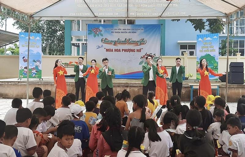Nghệ sĩ Huy Quyền (thứ 4, từ trái qua) biểu diễn, phục vụ thiếu nhi tại ấp 7, xã Đắc Lua hè năm 2023