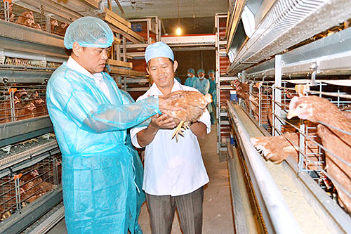 Ông Lâm Thanh Đức (bìa phải) tại trang trại sản xuất trứng gà sạch.