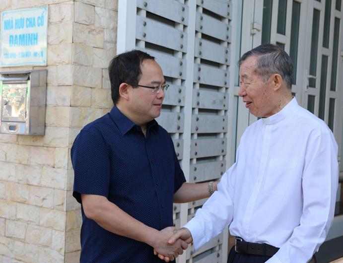 Phó Bí thư Tỉnh ủy, Trưởng Đoàn ĐBQH tỉnh Quản Minh Cường trò chuyện cùng Linh mục Trần Xuân Thảo, Phó chủ tịch Ủy ban Đoàn kết Công giáo Việt Nam, Chủ tịch Ủy ban Đoàn kết Công giáo Việt Nam tỉnh