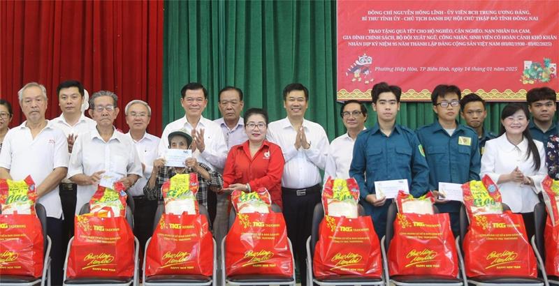 Bí thư Tỉnh ủy Nguyễn Hồng Lĩnh cùng các đại biểu và thành viên các gia đình được nhận quà tết do Hội Chữ thập đỏ tỉnh tổ chức tại phường Hiệp Hòa, thành phố Biên Hòa