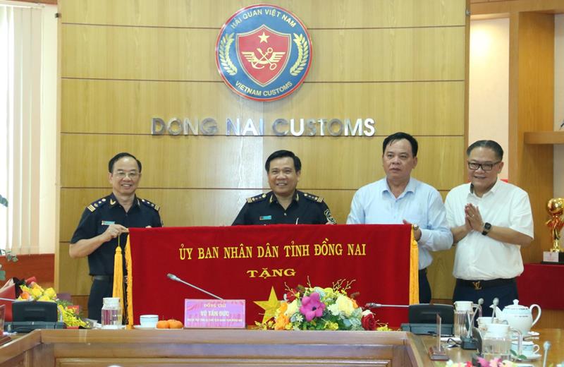 Chủ tịch UBND tỉnh Võ Tấn Đức trao bức trướng của UBND tỉnh cho Cục Hải quan Đồng Nai