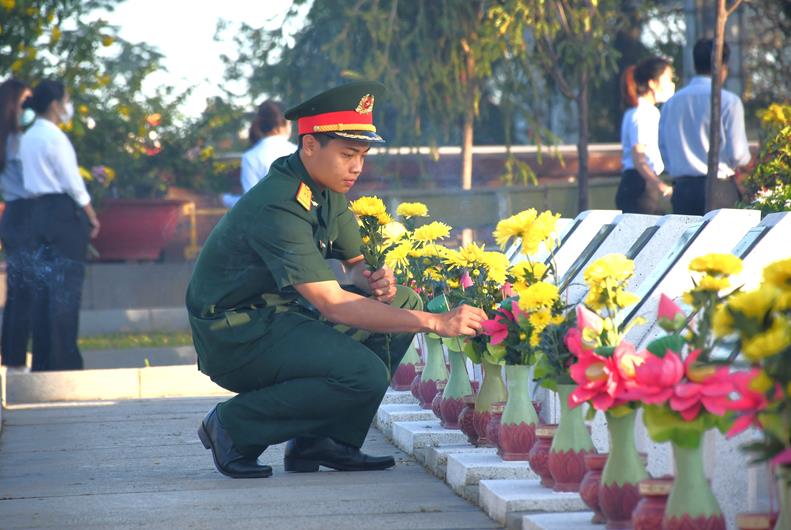 Chiến sĩ thắp hương các mộ phần tại Nghĩa trang liệt sĩ tỉnh