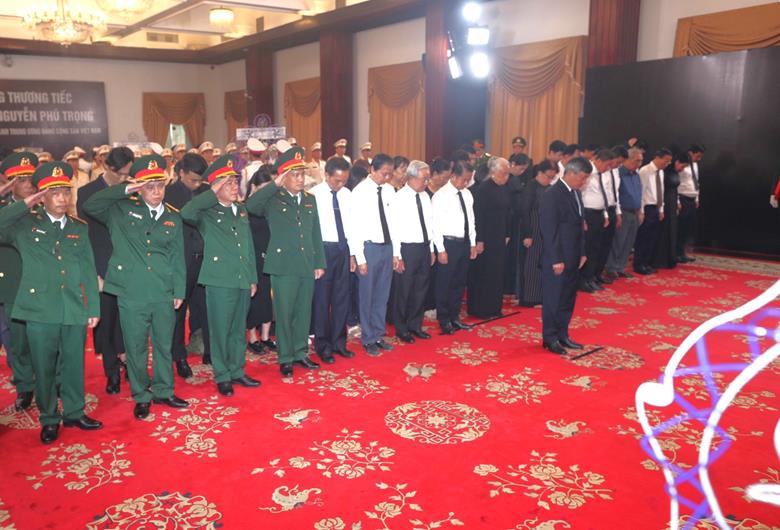 Các đồng chí lãnh đạo tỉnh đã dành phút mặc niệm trước di ảnh Tổng Bí thư Nguyễn Phú Trọng với sự thành kính và niềm tiếc thương vô hạn tại Hội trường Thống nhất (Thành phố Hồ Chí Minh)
