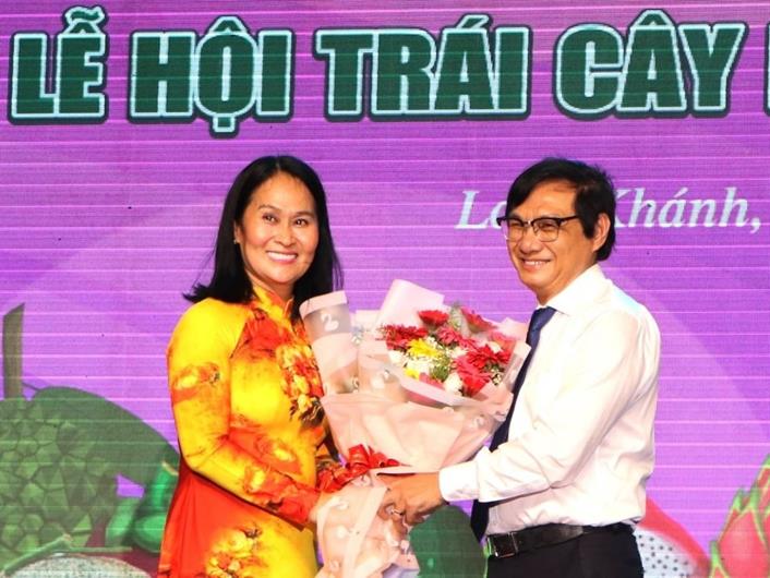 Phó Chủ tịch UBND tỉnh Nguyễn Sơn Hùng tặng hoa chúc mừng TP.Long Khánh tổ chức lễ hội trái cây