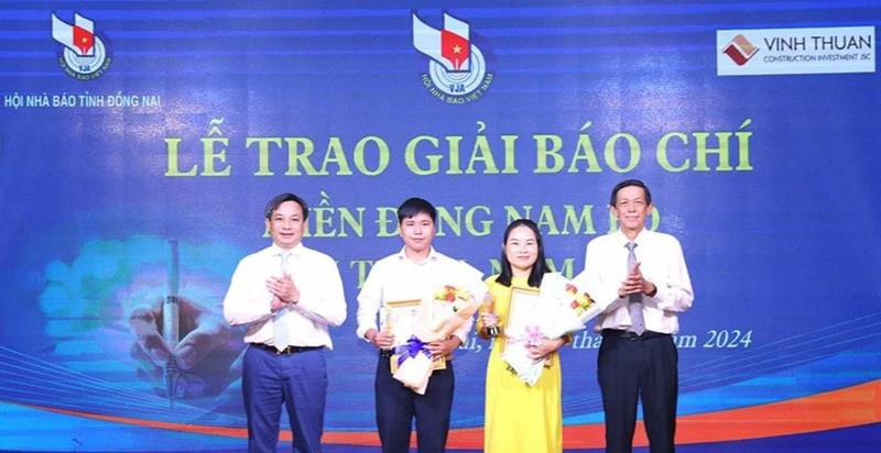 Ban Tổ chức trao giải Nhất ở thể loại Báo in cho nhóm tác Vương Văn Thế, Lê Thị Quyên (Báo Đồng Nai)