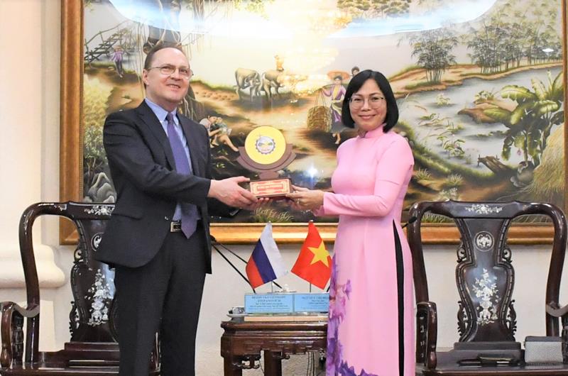 Phó Chủ tịch UBND tỉnh Nguyễn Thị Hoàng tặng quà lưu niệm cho Ngài Đại sứ đặc mệnh toàn quyền Liên bang Nga tại Việt Nam - K.Giới