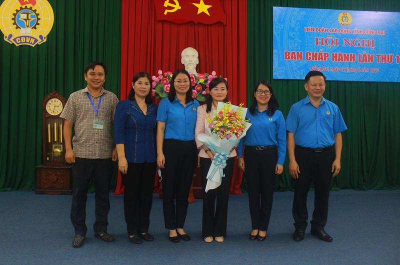 Thường trực LĐLĐ tỉnh và các đại biểu tặng hoa chúc mừng đồng chí Bùi Thị Bích Thủy