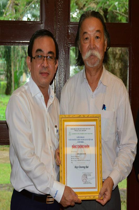 Nhạc sĩ Hoàng Lương (bìa phải) vinh dự nhận huy chương bạc Liên hoan Tuyên truyền ca khúc ngành cao su Việt Nam năm 2021