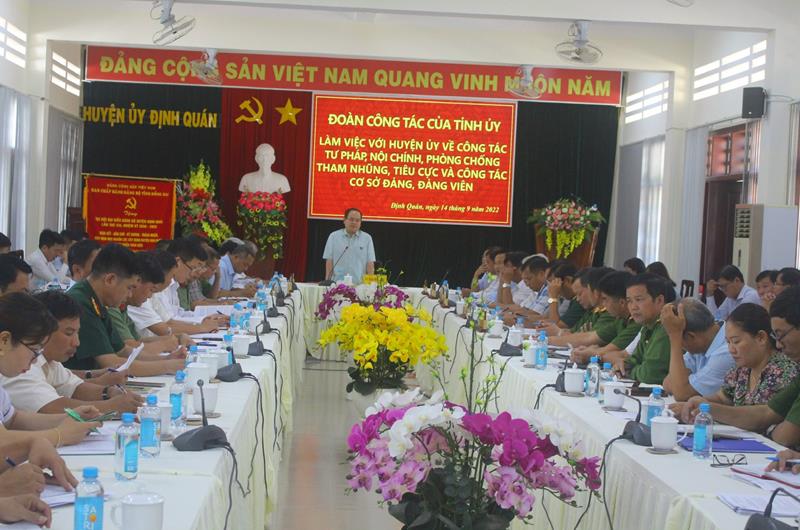 Ngày 14-9, Đoàn công tác do Phó Bí thư Tỉnh ủy, Trưởng đoàn Đại biểu Quốc hội tỉnh Quản Minh Cường làm trưởng đoàn đã có buổi làm việc với Huyện ủy Định Quán về công tác tư pháp, nội chính, phòng chống tham nhũng, tiêu cực và công tác cơ sở đảng, đảng viên.