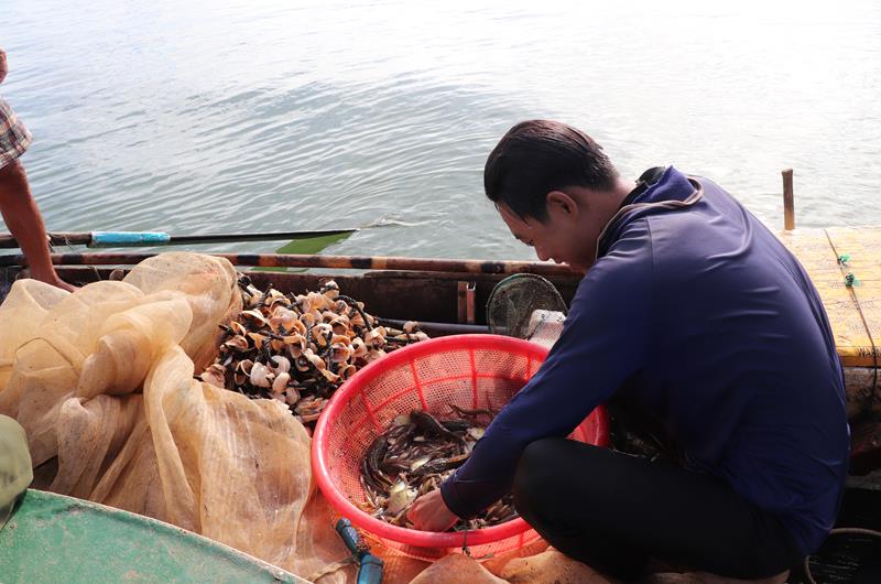 Sau hơn 15 phút lùa cá bống vào lưới, người con trai của bà Thủy bắt đầu cầm sợi ống nhựa thở oxy ngậm vào miệng rồi rời thuyền để lặn xuống dòng nước sâu tháo gỡ những vật vướng vào lưới và thu gom lưới cá. Ở trên ghe, vợ chồng bà Thủy hỗ trợ nhau cùng kéo lưới lên. Mẻ lưới thu hoạch đầu tiên của gia đình không được nhiều, chỉ khoảng 1kg cá bống cát.