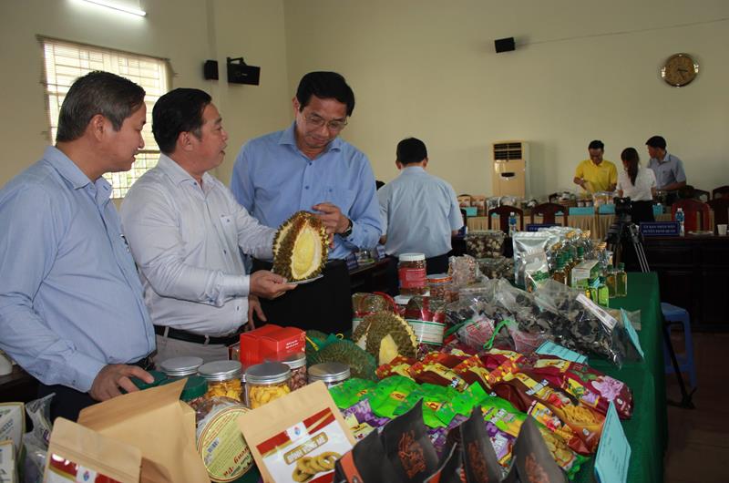 Phó Chủ tịch UBND tỉnh Võ Văn Phi và các thành viên Hội đồng đánh giá, phân hạng sản phẩm Chương trình mỗi xã một sản phẩm OCOP tỉnh tham quan gian trưng bày sản phẩm tại hội nghị. Ảnh: Phan Anh