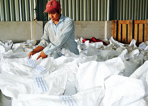 Đóng gói hồ tiêu sạch xuất khẩu sạch của HTX Lâm San với các mã số dùng để truy xuất nguồn gốc.