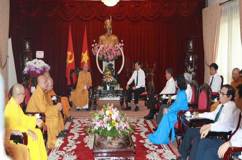 Bí thư Tỉnh ủy Nguyễn Hồng Lĩnh trao đổi cùng các thành viên Ban Trị sự Giáo Hội Phật giáo Việt Nam tỉnh.
