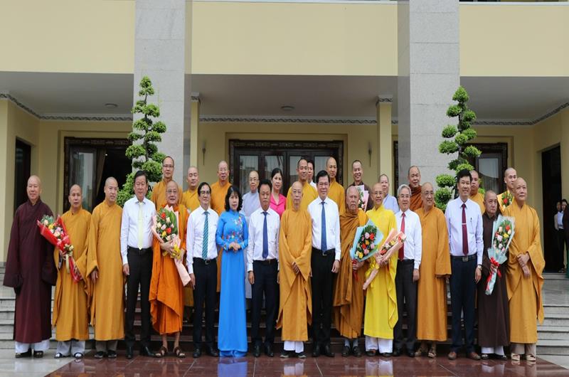 Bí thư Tỉnh ủy Nguyễn Hồng Lĩnh cùng các đồng chí lãnh đạo Ủy ban MTTQ Việt Nam tỉnh, Ban Dân vận Tỉnh ủy, UBND tỉnh, HĐND tỉnh tặng hoa chúc mừng các thành viên Ban Trị sự Giáo Hội Phật giáo Việt Nam tỉnh.