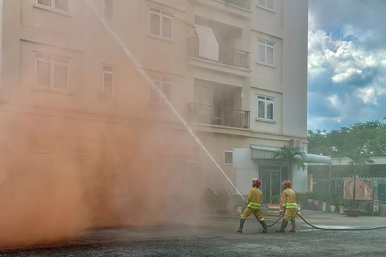 Lực lượng Cảnh sát phòng cháy, chữa cháy diễn tập chữa cháy tại khối nhà A5, chung cư Nguyễn Văn Trỗi (P.Quang Vinh, TP.Biên Hòa) vào tháng 8-2023