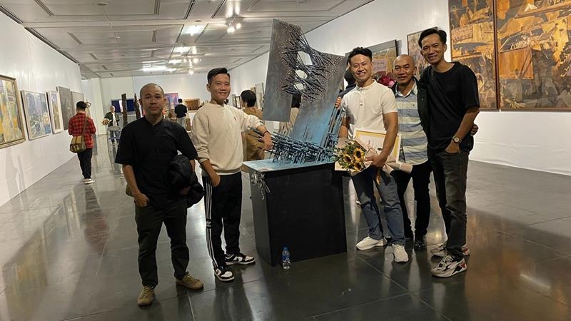 Tác giả Trần Đình Thắng (thứ 3 từ phải qua) bên tác phẩm Phố nghiêng đoạt giải nhì tại Triển lãm mỹ thuật Việt Nam năm 2023