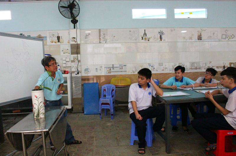 Họa sĩ Nguyễn Quang Hoàng hướng dẫn học sinh khiếm thính tại Trường Khiếm thính Hoa Lan, P.Bình Đa, TP.Biên Hòa học vẽ