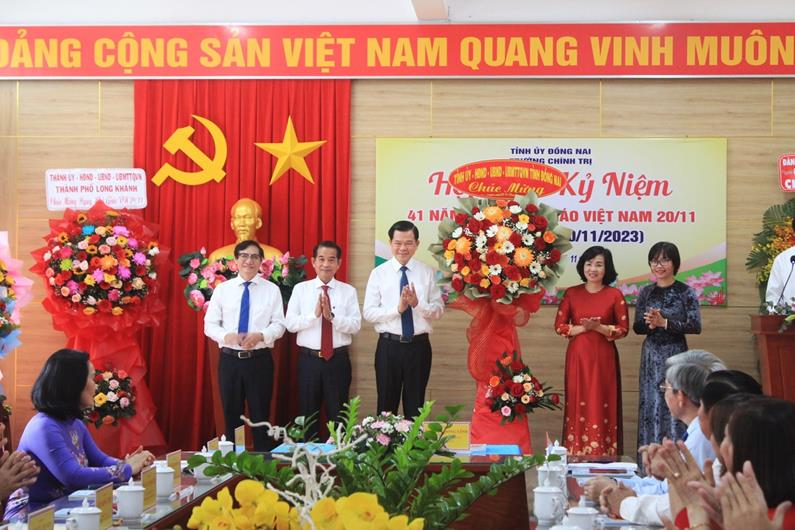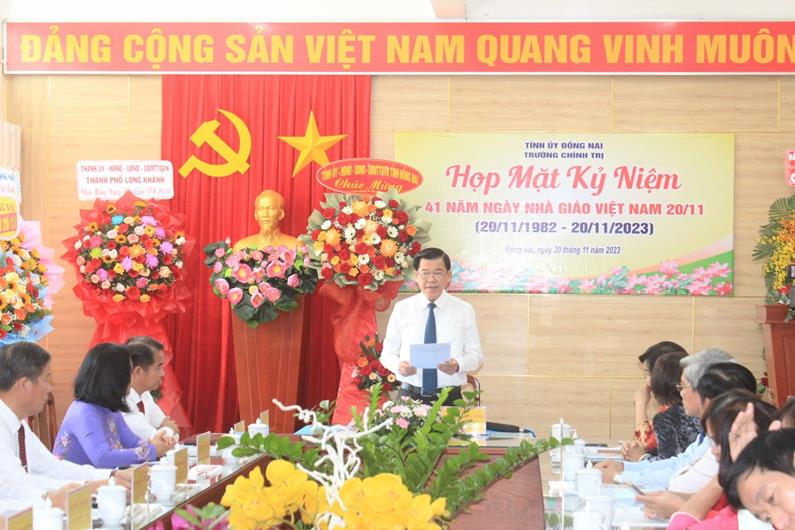 Nhân Ngày nhà giáo Việt Nam 20-11, đồng chí Bí thư Tỉnh ủy gửi lời chúc mừng tốt đẹp nhất đến tập thể cán bộ, giảng viên, nhân viên nhà trường. Đồng thời tin tưởng Trường Chính trị tỉnh luôn phát huy truyền thống, không ngừng phấn đấu, nâng cao phẩm chất chính trị, đạo đức, năng lực chuyên môn, phát huy vai trò năng động, sáng tạo vươn lên trở thành nhân tố nòng cốt tiên phong, cống hiến nhiều hơn nữa để xây dựng đội ngũ cán bộ tỉnh Đồng Nai có năng lực thực tiễn, có đạo đức, lối sống lành mạnh, tuyệt đối trung thành với mục tiêu, lý tưởng và sự nghiệp của Đảng; góp phần xây dựng Đảng bộ tỉnh ngày càng trong sạch, vững mạnh, thực hiện thắng lợi các mục tiêu, chỉ tiêu, nhiệm vụ chủ yếu được đề ra hàng năm và cả nhiệm kỳ 2020-2025