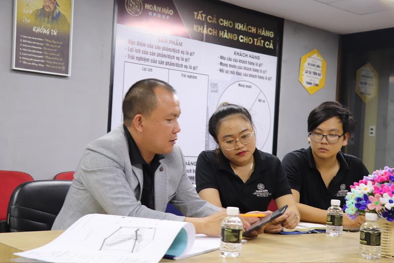 Anh Phạm Bá Lực, Giám đốc công ty TNHH Nội thất Hoàn Hảo đang họp bàn với nhân viên