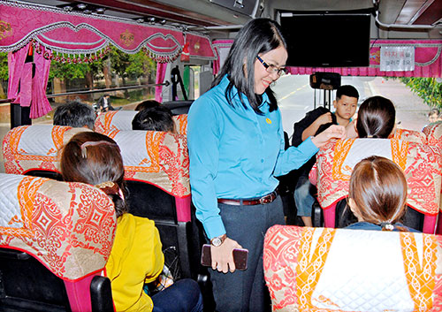 Chủ tịch LĐLĐ tỉnh Nguyễn Thị Như Ý thăm hỏi công nhân trước giờ xe lăn bánh đưa công nhân về quê đón Tết Nguyên đán Kỷ Hợi 2019.