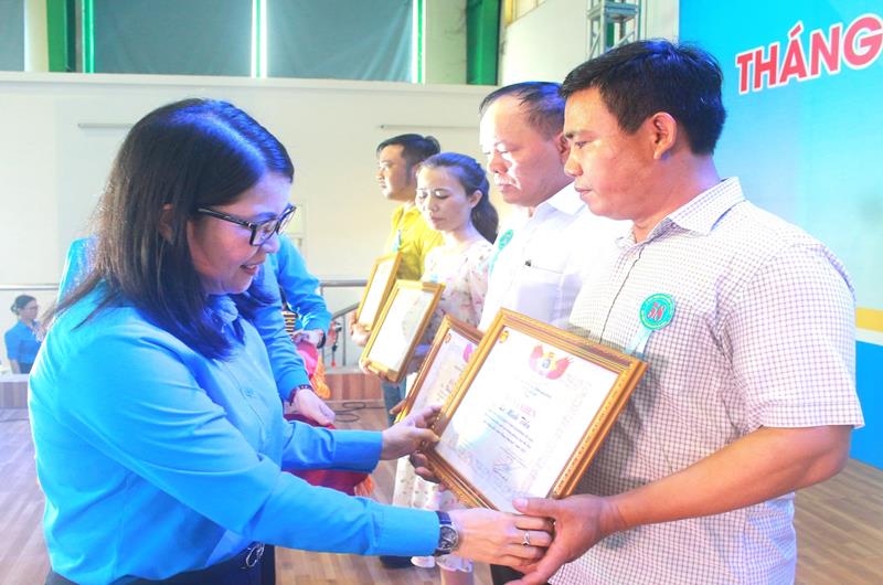 Chủ tịch Liên đoàn Lao động tỉnh Nguyễn Thị Như Ý khen thưởng công nhân tiêu biểu