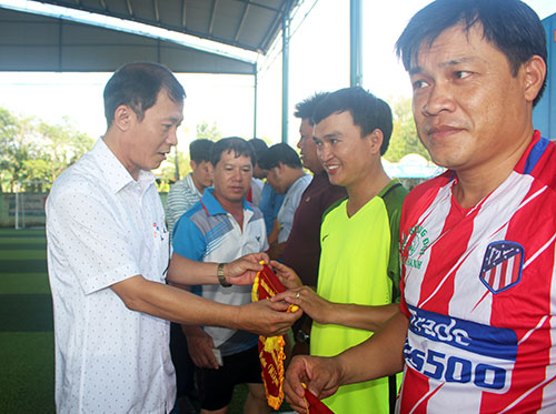 Chủ tịch LĐLĐ huyện Long Thành Nguyễn Hữu Thành trao cờ lưu niệm cho các đội bóng tham gia hội thi văn nghệ thể thao trong CNVCLĐ huyện Long Thành.