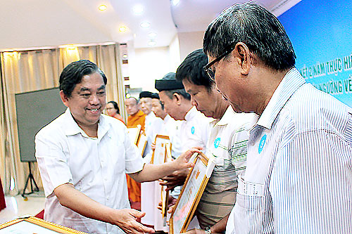 Chủ tịch Ủy ban MTTQ tỉnh Huỳnh Văn Tới khen thưởng các tổ chức tôn giáo và cá nhân thực hiện tốt nhiệm vụ bảo vệ môi trường.