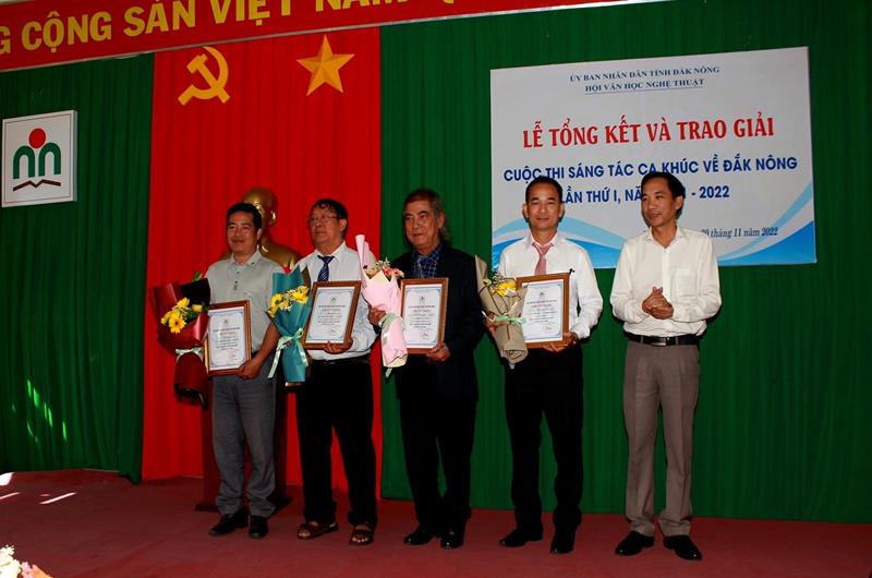 Nhạc sĩ Nguyễn Phương (thứ 2 từ trái qua) Chi hội trưởng Chi hội Nhạc sĩ Việt Nam tỉnh Đồng Nai đoạt giải khuyến khích cuộc thi sáng tác ca khúc về Đắk Nông