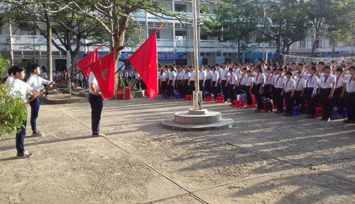 Với các trường học, 100% các trường học trên địa bàn huyện đều thực hiện rất trang nghiêm lễ chào cờ sáng đầu tuần theo đúng nghi thức Ðoàn, Ðội. Trường THCS Phước Thiền là một trong những đơn vị điển hình thực hiện tốt và có cách làm hay, lồng ghép nhiều hoạt động ý nghĩa và thiết thực cho học sinh trong buổi chào cờ. Anh Nguyễn Hữu Lộc, Tổng phụ trách Ðội cho biết: “Tất cả các sáng thứ hai hằng tuần, nhà trường đều thực hiện nghi thức chào cờ đối với giáo viên và học sinh. Nhà trường xem đây là một trong những tiêu chí thi đua giữa các lớp học trong công tác Ðoàn, Ðội. Qua đó góp phần tuyên truyền, phổ biến giáo dục pháp luật, hướng dẫn những kỹ năng sống và công tác phòng, chống bạo lực học đường, ma túy trong trường học. Ðặc biệt, nhà trường đã tổ chức cho học sinh tham gia thi tìm hiểu lịch sử Ðảng, tìm hiểu Luật An toàn giao thông dưới hình thức “Ðố vui có thưởng” sau khi kết thúc nghi thức chào cờ…”.