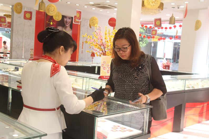 Khách hàng nữ tham khảo các mẫu nữ trang tại một cửa hàng kim hoàn tại TP.Biên Hòa