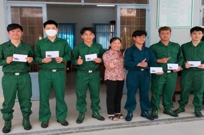 Bà Phú Vĩnh Viễn trao quà cho các thanh niên lên đường nhập ngũ năm 2023 trên địa bàn khu phố