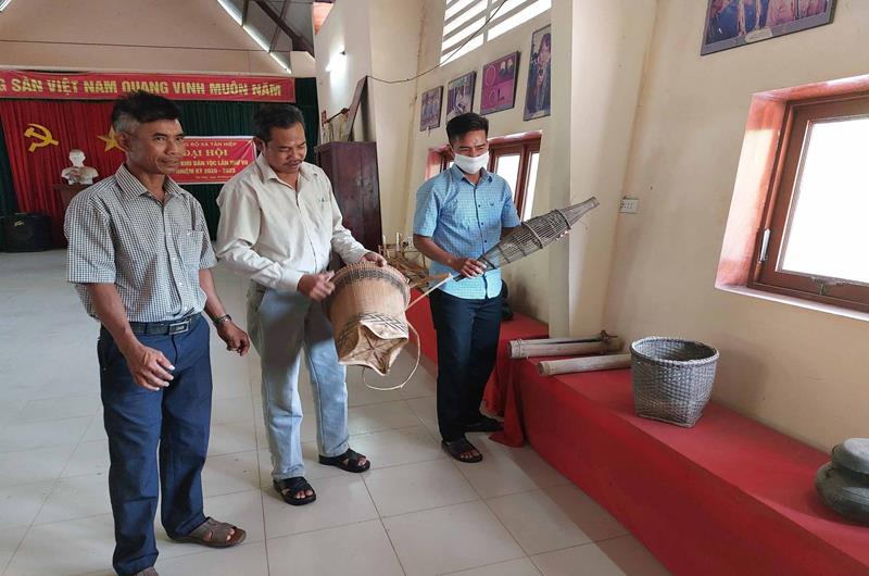 Ông Điểu Phua (giữa) cùng với các thành viên trong ban ấp kiểm tra hiện vật trưng bày của đồng bào tại Nhà văn hóa dân tộc S’tiêng