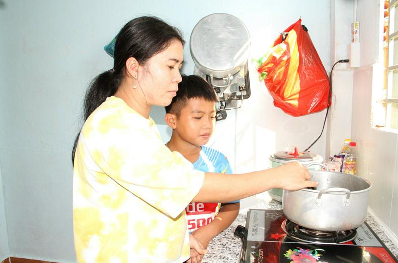 Vợ con ông K’Tấn (xã Thanh Sơn, H.Tân Phú) nấu ăn trong căn bếp tươm tất ở căn nhà mới