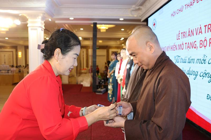 Đại đức Thích Quý Trì, trụ trì Chùa Tịnh Châu Như Ý (P.Thống Nhất, TP.Biên Hòa) nhận thẻ đăng ký hiến mô, bộ phận cơ thể người và hiến xác cho y học và quà tri ân từ Hội Chữ thập đỏ tỉnh.