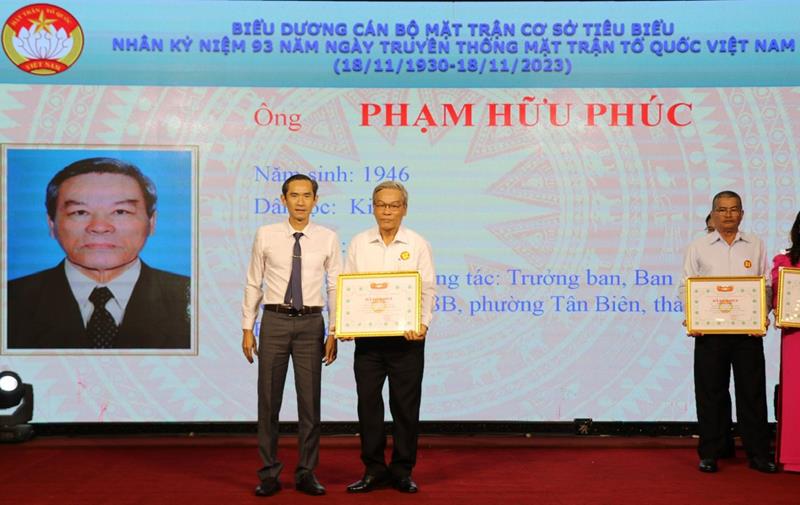 Ông Phạm Hữu Phúc, Trưởng ban Công tác Mặt trận KP.8B, P.Tân Biên, TP.Biên Hòa nhận tuyên dương 93 tấm gương làm công tác Mặt trận ở cơ sở tiêu biểu năm 2023 nhân dịp kỷ niệm 93 năm Ngày truyền thống MTTQ Việt Nam