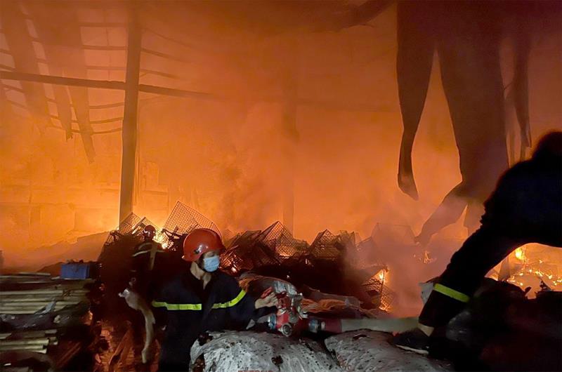 Lực lượng Cảnh sát PCCC xử lý vụ cháy tại Công ty TNHH United Jumbo (Khu công nghiệp Suối Tre, TP.Long Khánh) vào tối 29-11-2021, thiêu rụi 6.000 m² nhà xưởng, gây thiệt hại hơn 1,1 tỷ đồng. Ảnh: Trúc Viên