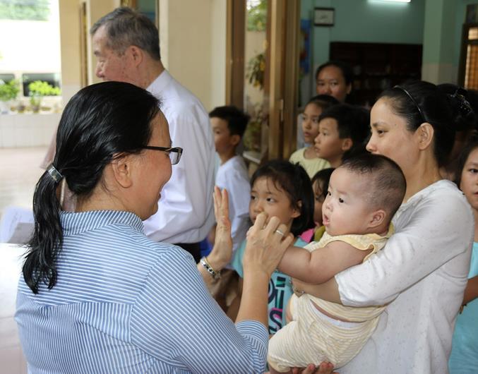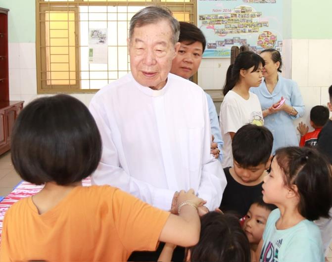 Linh mục Trần Xuân Thảo, Giám đốc Trung tâm nuôi dưỡng trẻ mồ côi Giáo xứ Hà Nội (TP.Biên Hòa) bên trẻ em được chăm sóc tại đây