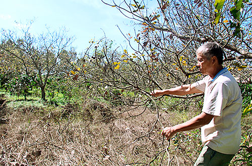 Một vườn điều tại xã Phú An, huyện Tân Phú bị cháy lá và chết do sương muối và mưa trái mùa xảy ra đầu năm 2017.