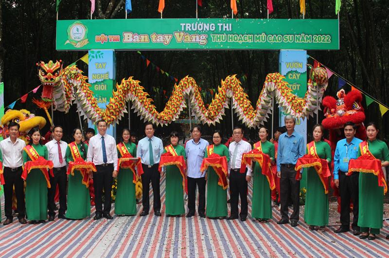 Các đại biểu cắt băng khai mạc hội thi Bàn tay vàng khai thác mủ cao su năm 2022