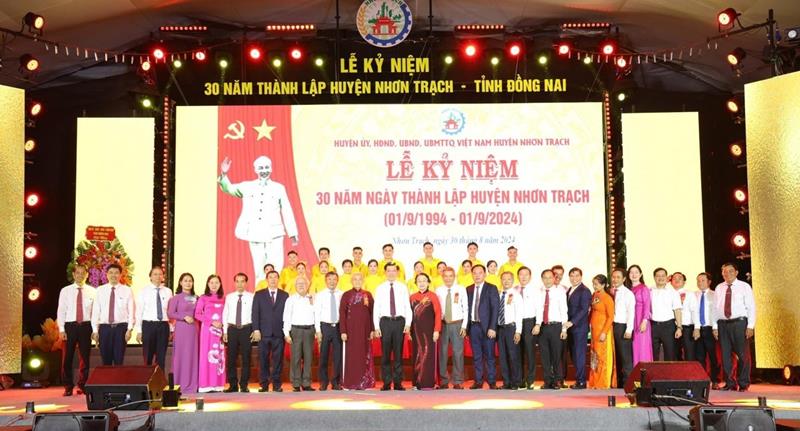 Nhân dịp này, Đảng bộ, chính quyền và Nhân dân huyện Nhơn Trạch đã vinh dự được nhận bức trướng của UBND tỉnh với nội dung: Đảng bộ - chính quyền và Nhân dân huyện Nhơn Trạch 30 năm xây dựng và phát triển (1-9-1994 - 1-9-2024).