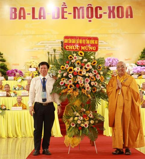 Lãnh đạo Ban Tôn giáo tỉnh tặng hoa chúc mừng của UBND tỉnh đến ban tổ chức đại giới đàn.