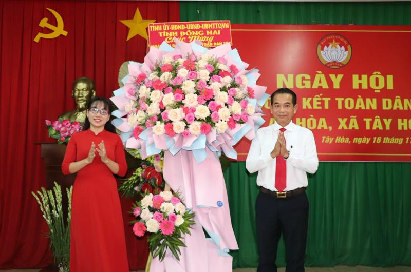 Đồng chí Thái Bảo, Chủ tịch HĐND tỉnh tặng lẵng hoa chúc mừng Ngày hội Đại đoàn kết cho ấp An Hòa